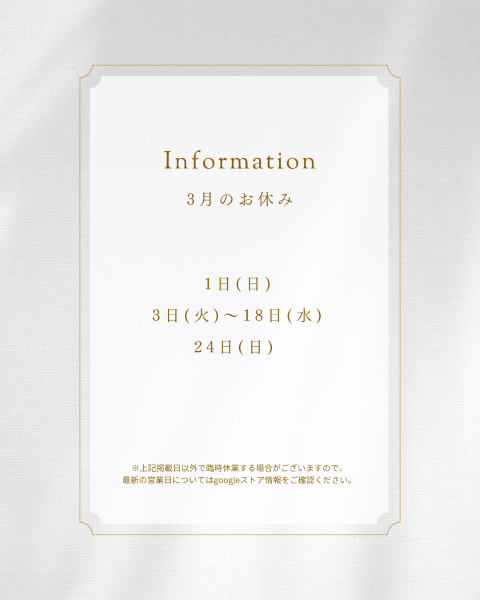 3月3日(月)〜3月19日(木)まで長期休業とさせていただきます。