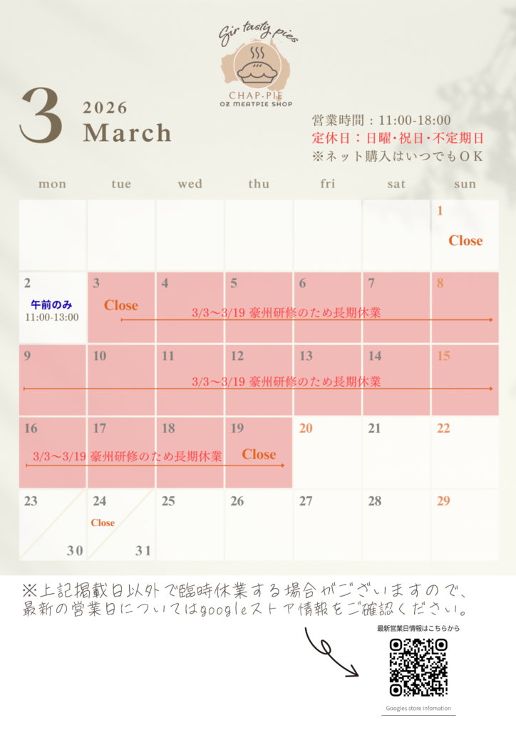 このたび、店主がオーストラリアへミートパイ研修の旅に出るため、