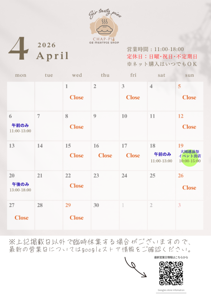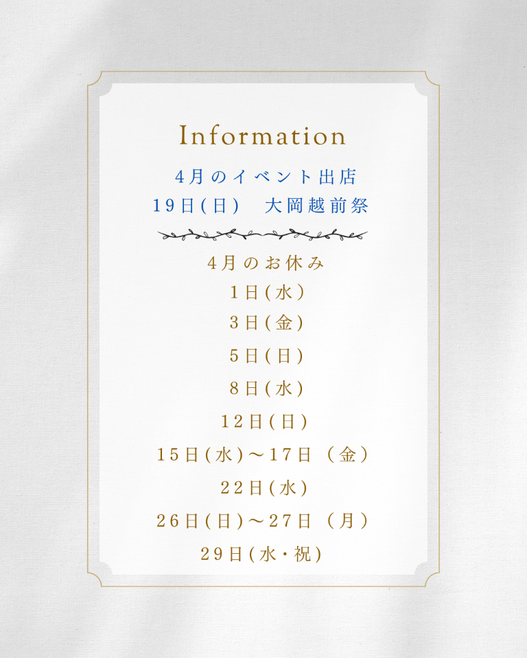 注)イベント出店日はイベント会場での販売となり、店舗での販売はお休みとなります。